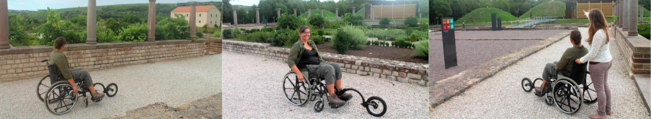 Im Info-Zentrum Maison Jean Schaub kann ein Outdoorrad-Adapter ausgeliehen werden, mit dem auch im Rollstuhl die Wiesen- und Kieswege leicht überwunden werden können.